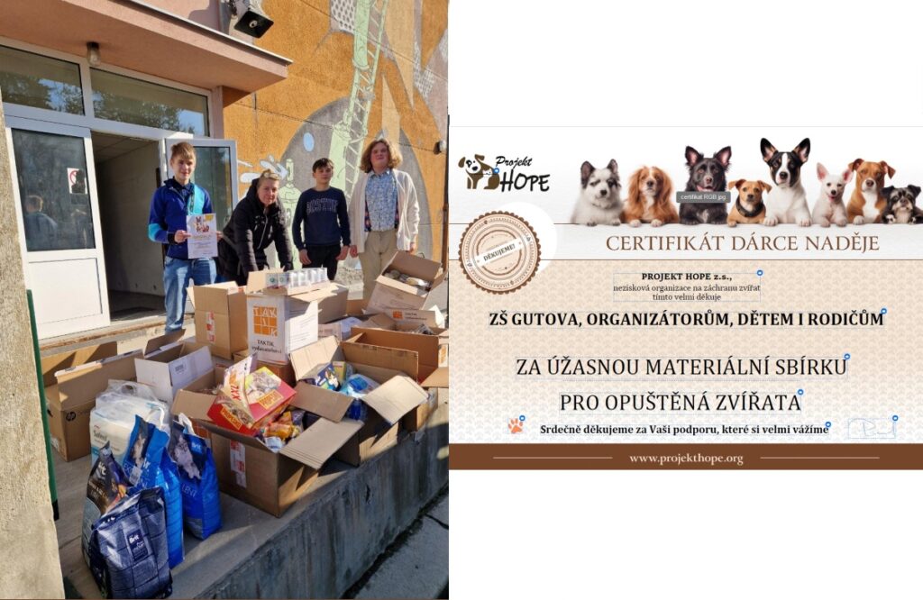 PROJEKT HOPE z.s., který sídlí přímo v Praze 10 v Gutově ulici. Tento projekt se dlouhodobě zaměřuje na dočasnou domácí péči o opuštěné psy a kočky. Díky sbírce získal projekt více než 300 kg krmiva a steliva!